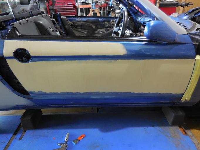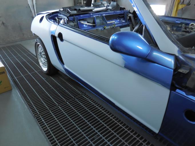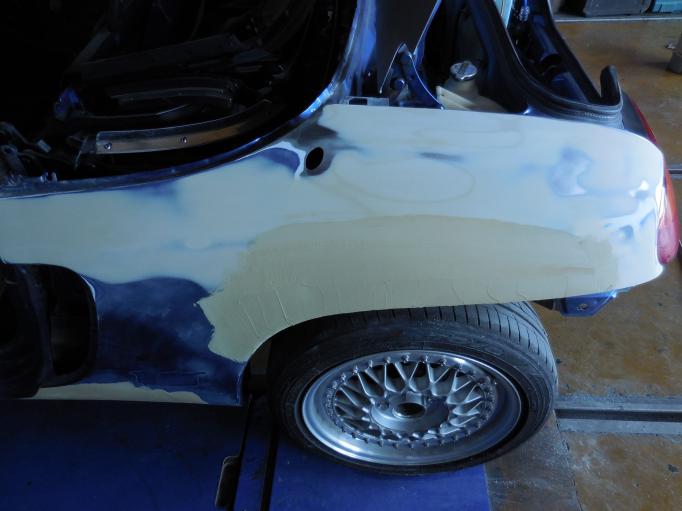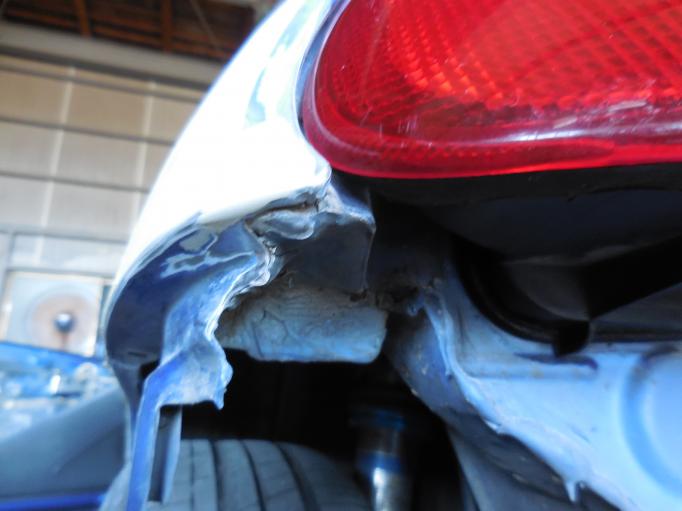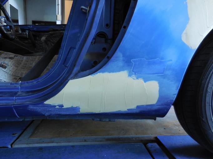 | 右リヤフェンダー、アーチ部分の錆穴をふさいで 鈑金します。 右ドアも全面鈑金です。 左側もほぼ全面鈑金です。 左テールわきの角つぶれも修正します。 鈑金後、一時サフェーサーをいれます。 |