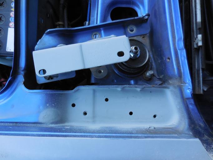 スペアタイヤキャリアの取付ステー部分が、亀裂発生で修理してあり、とんでもない方法で修理してあったので、パネル穴塞ぎ鈑金し、正規の位置に溶接し直します。 全体塗装時に、塗装します。 けん引フック曲がりで、鈑金します。 |  |